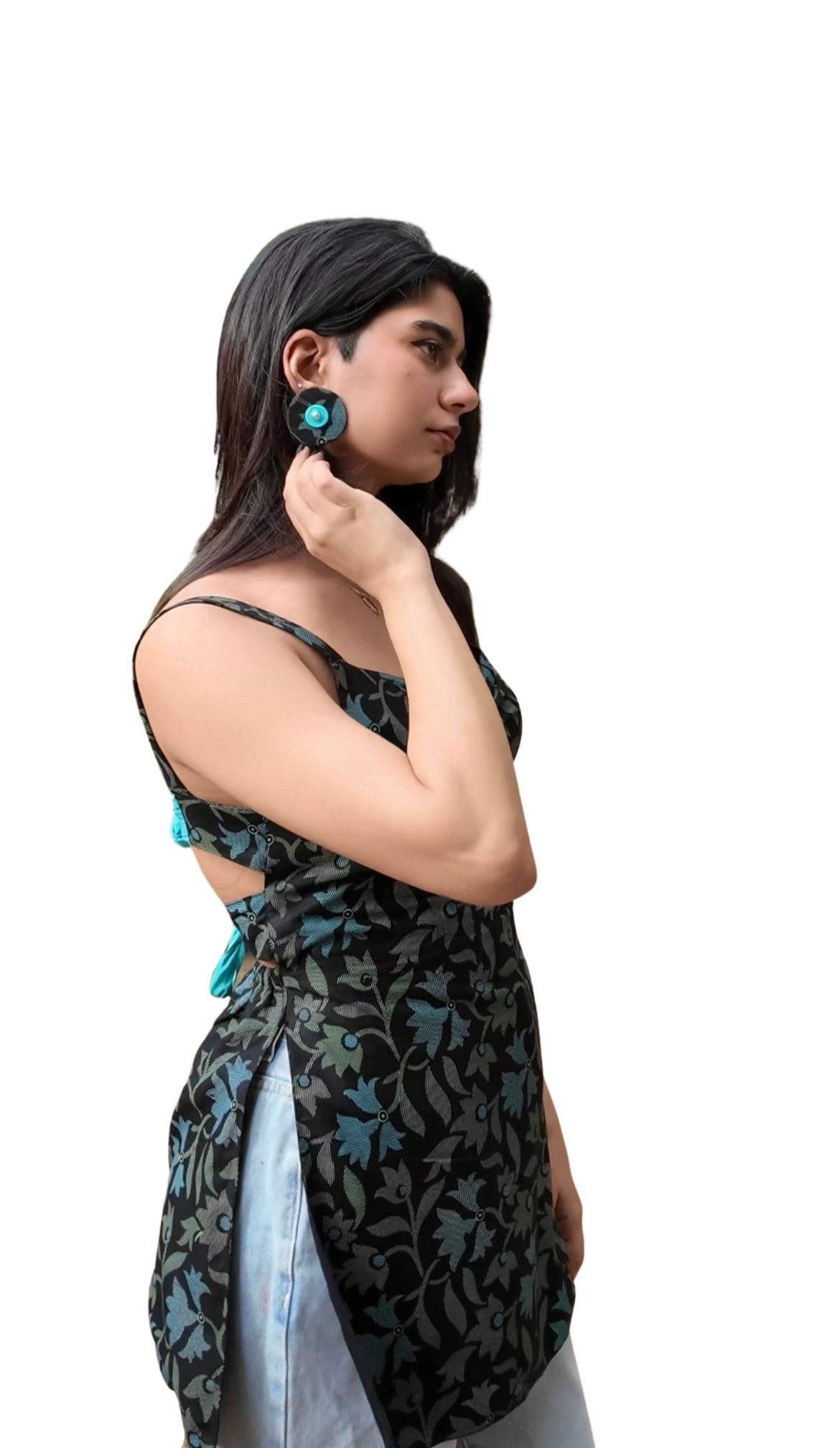 Step into the spotlight with LAVAANYA our Stylish & Double Bow Back Kurti, a chic and playful addition to your wardrobe. Crafted from breathable fabric , this kurti features a flattering silhouette that pairs effortlessly with pants, jeans or shorts. Slip on our handmade matching Fabric earrings and it’s perfect for the trendsetter Girl.