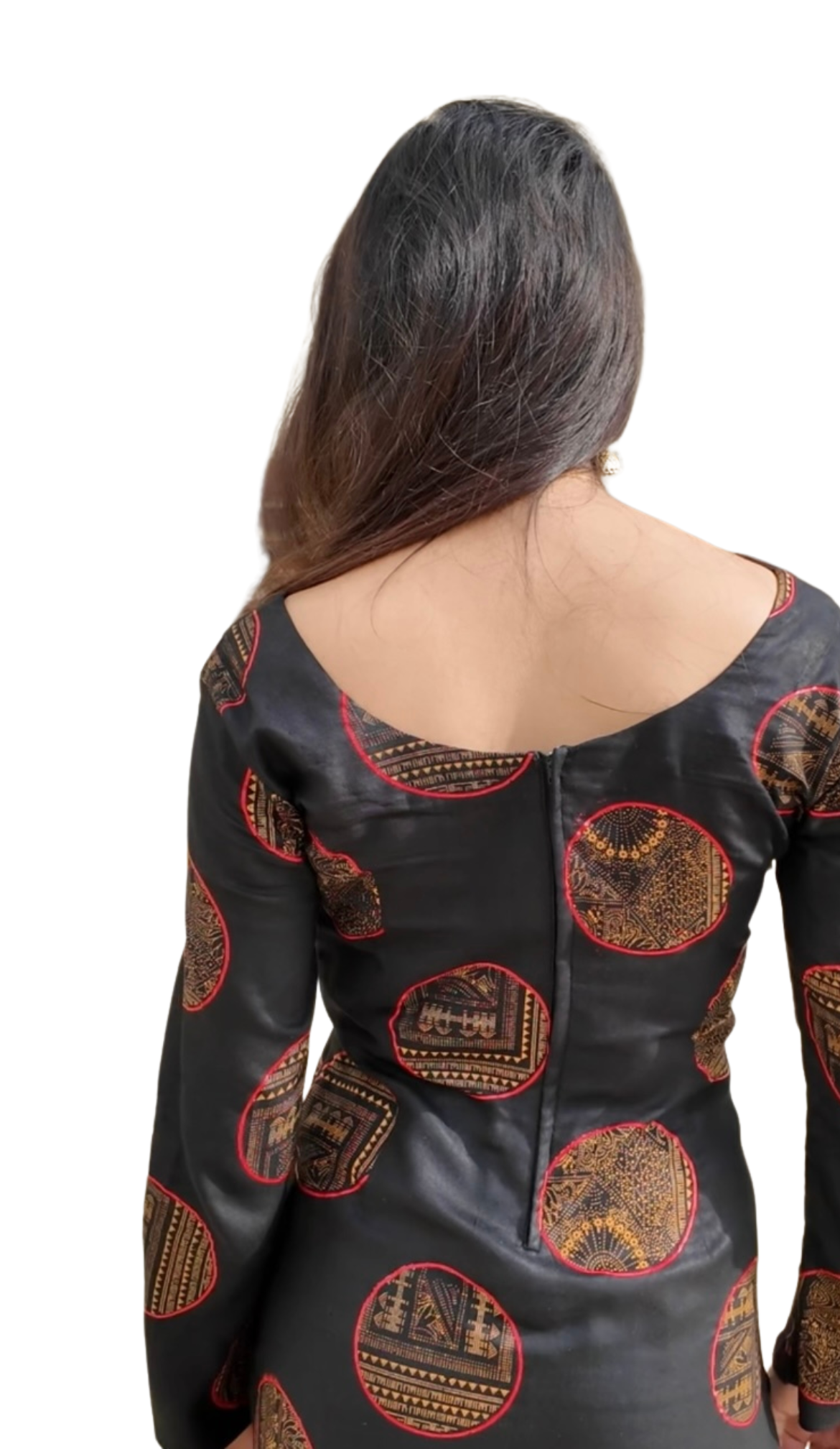 A broad neckline and a discreet rear zipper deliver a flattering, tailored fit—easy to slip into yet polished in form. Paired with our complimentary fabric earrings uniquely made to complete your look.