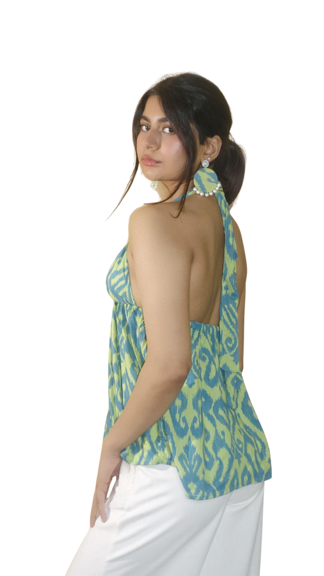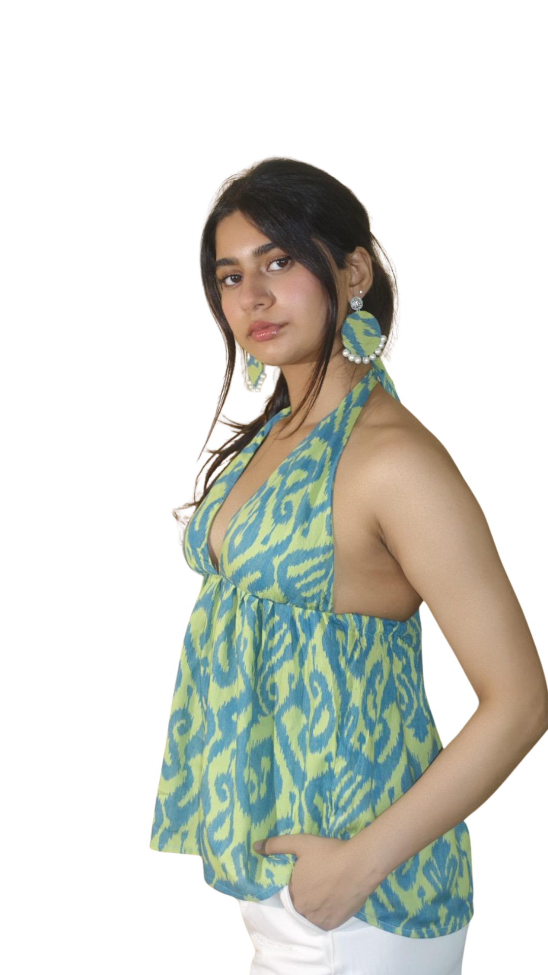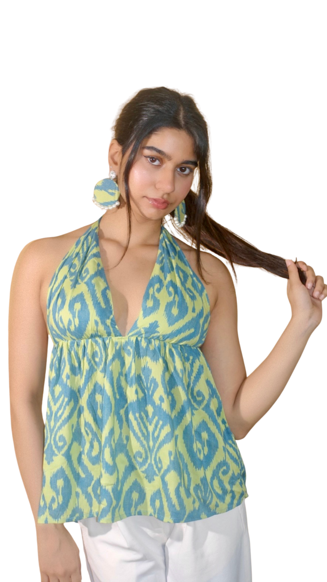 Elevate your style with SWASTI our halter neck top with a twist of handmade charm. Crafted for confidence and comfort, this top brings sleek lines and effortlessly flattering fit.  A real showstopper! The lightweight fabric making it a wardrobe must-have matched with a pair of handcrafted fabric earrings made of the same fabric-a thoughtful detail that completes your look with a unique artisanal twist.